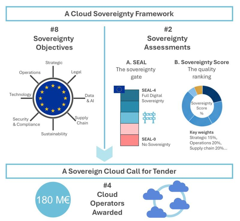 Η Ευρωπαϊκή Επιτροπή κάνει ήδη πράξη το πλαίσιο μέσω της νέας πρωτοβουλίας «Sovereign Cloud Procurement», με στόχο την προμήθεια υπηρεσιών cloud αξίας 180 εκατομμυρίων ευρώ για τα θεσμικά όργανα και τους οργανισμούς της ΕΕ. Η πρωτοβουλία αυτή λειτουργεί ως πιλότος για την πρακτική εφαρμογή της κυριαρχίας στο νέφος — διασφαλίζοντας ότι οι ευρωπαϊκές υποδομές cloud είναι ασφαλείς, διαφανείς και πλήρως σύμφωνες με το ευρωπαϊκό ρυθμιστικό και στρατηγικό πλαίσιο.